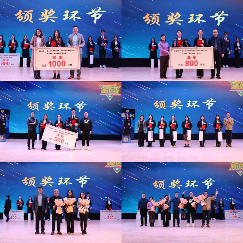 席炳雯、计算机科学与工程学院高一丁、工商管理学院刘罗杰获得季军,卫晓萍、黎如梦、赵琼雪、李雅文、李姝仪、王嘉莹获得优秀奖。颁奖环节,韩磊、刘锃一、夏风云以及五位评委为获奖选手颁奖,隋永强、杜宝贵分别为五位优秀评委和四位优秀导师颁奖。