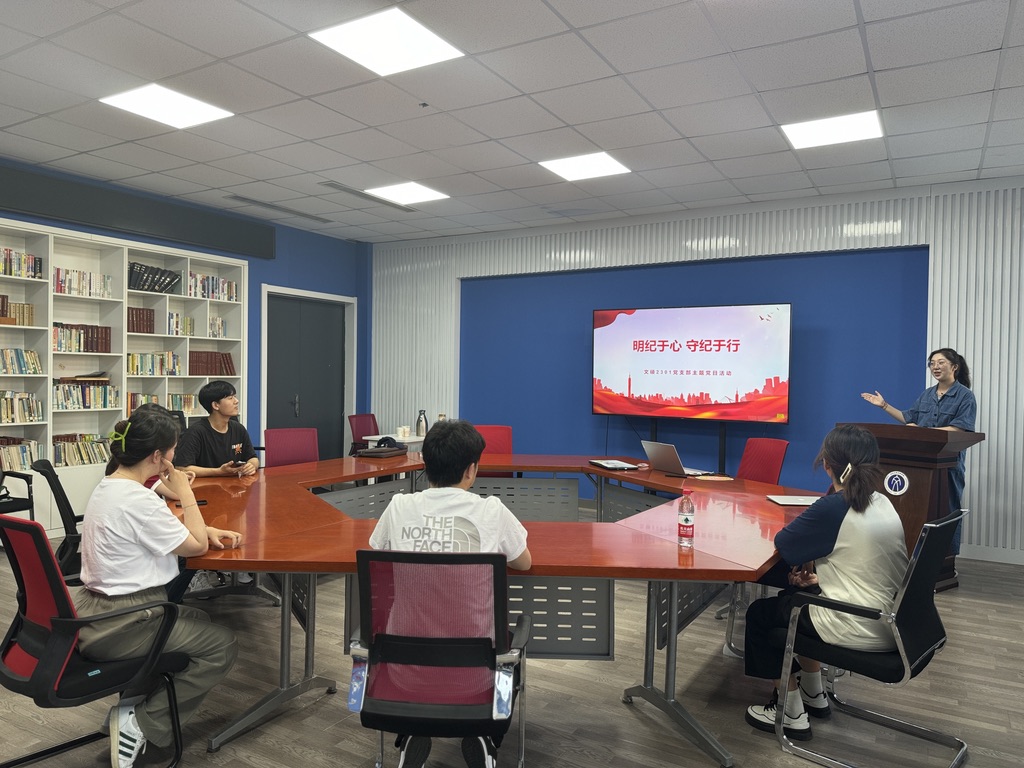 6月5日,文硕2301党支部在文管学馆A215室开展“明纪于心 守纪于行”党纪学习教育主题党日活动,党支部书记许萌哲主持活动,支部全体党员参加。