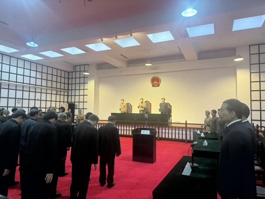 随后,支部成员们来到审判庭场景复原区,这里复原了当年的审判庭场景,审判席、被告席、公诉人席、证人席、辩护人席均按照当年陈设布展。支部成员们在这里合影留念,并集体重温入党誓词,表达了对党的忠诚和对祖国的热爱。