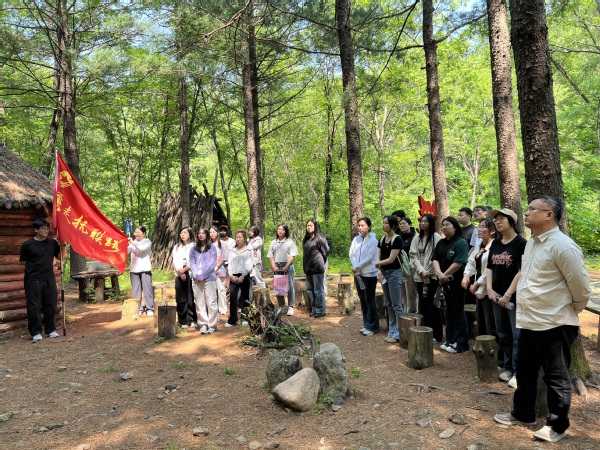 下午,师生队伍前往关门山国家森林公园,踏上“重走抗联路“的征程。沿着崎岖的山路,大家亲身感受抗联战士们当年行军的艰难险阻,体会他们在困境中不屈不挠的意志。在密营遗址,班主任为师生们讲述抗联交通站及密营的故事,让大家更加直观地理解东北抗联精神的内涵。在互动体验环节《革命人永远是年轻》中,两院师生合唱抗联歌曲,将活动氛围推向高潮。