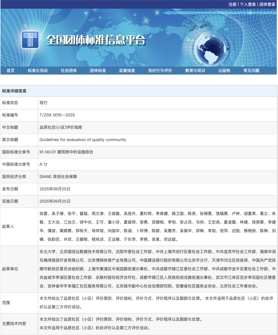 城乡公共治理研究团队张雷教授、吴子靖特聘副研究员和张平教授编制的国家级标准T/ZSX 0015—2025《品质社区(小区)评价指南》正式发布。该标准是台湾swag